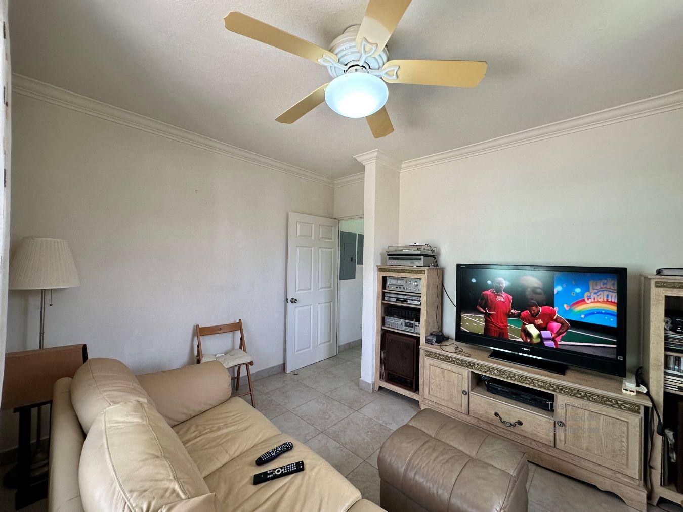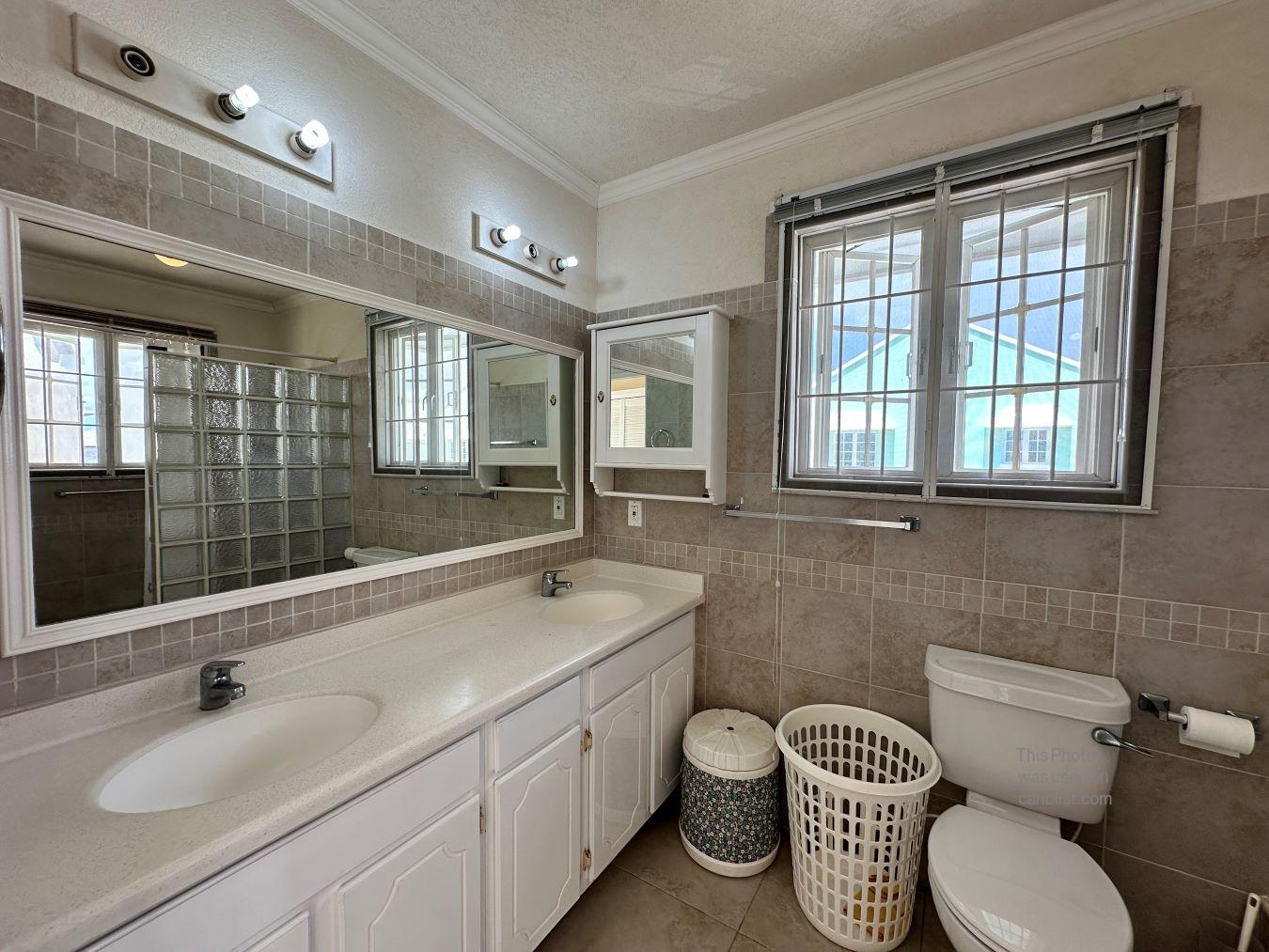 Upstairs, an open landing leads to three additional bedrooms and two bathrooms. The primary suite is a standout feature, offering generous proportions, a large closet, and an ensuite bathroom. Outdoor living is also emphasized, with a private ground-floor patio and an expansive upper sun deck that spans the width of the building—ideal for entertaining or simply relaxing in the island breeze.