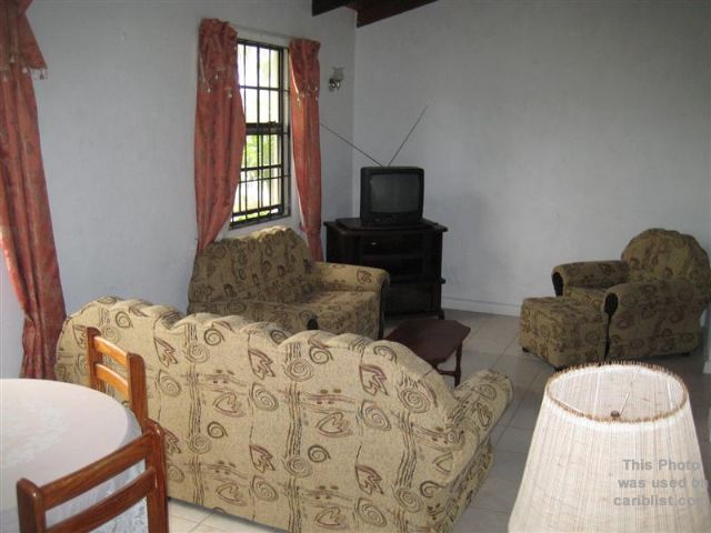 This upper level 2 bedroom, 1 bathroom apartment is fully furnished with a fridge, stove, microwave, television, living/dining room suite and beds in both bedrooms. There are also air condition units in both bedrooms. The rental price includes water. The apartment is very spacious and located in a good and central neighborhood and is a 2-minute drive to Sheraton Mall and other major amenities.