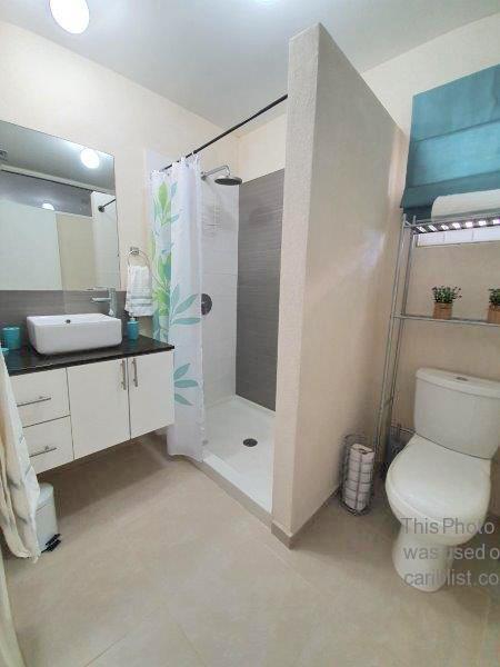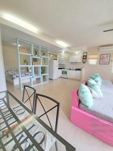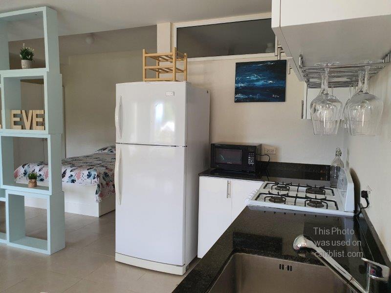 A lovely lower level and modern studio condo situated in the centrally located and charming Boarded Hall Green eco-friendly gated community. A small sheltered front patio leads in to a large open plan living and dining room which has an adjacent elegant kitchen complete with granite countertops, soft closing cabinets and appliances including a fridge and gas stove. The open area flows easily to the section having the queen sized bed and excellent cupboard space, which practically and discreetly is somewhat separated by a tall wooden partition. The elegant bathroom has a shower and vessel sink, and the unit is extremely bright with numerous windows, security bars, window screens. The unit also has a small enclosed garden and a pet is welcome.